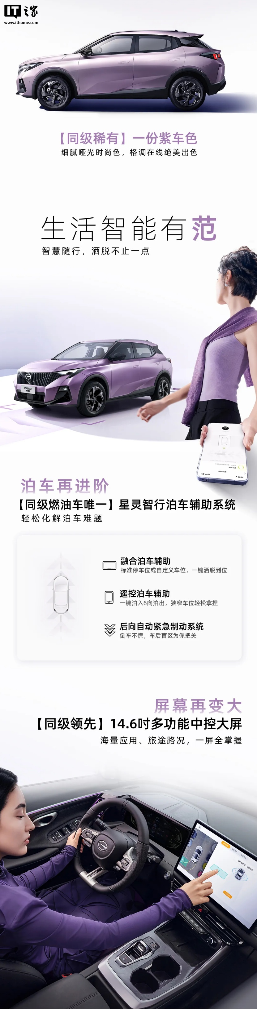 發(fā)動(dòng)機(jī),最大功率130kW,最大扭矩270N·m,匹配7擋雙離合變速箱。智能化配置方面,新車配備14.6英寸中控屏,并在頂配車型上提供同級(jí)燃油車唯一的星靈智行泊車輔助系統(tǒng)。