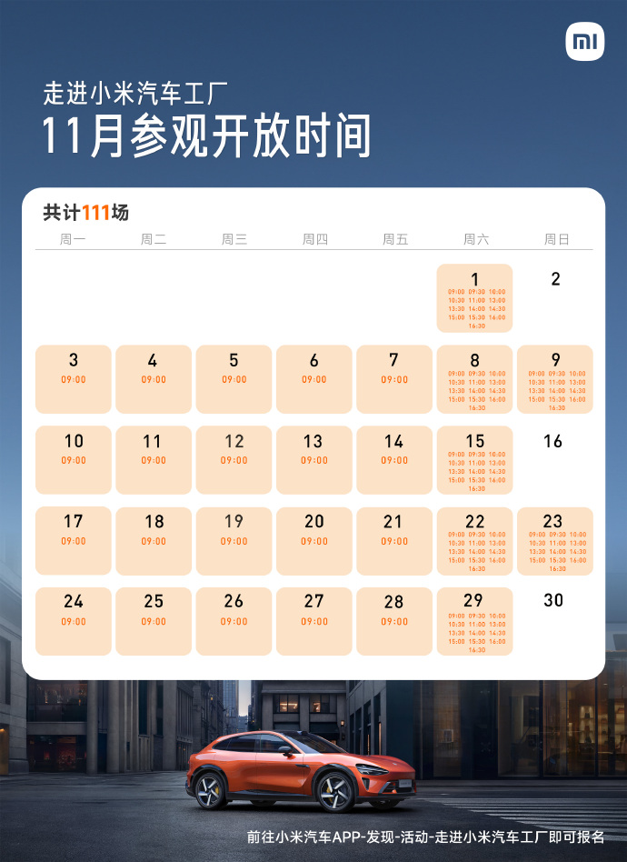 10月25日,小米汽車工廠迎來了2025年第十萬位游客,自2024年3月29日開園以來,已累計(jì)接待超14萬人。11月場(chǎng)次預(yù)約已開啟,全月總計(jì)開放111個(gè)參觀場(chǎng)次,周末場(chǎng)次單日增至13場(chǎng),額外增加下午16:30場(chǎng)次。用戶可通過小米汽車App參與報(bào)名。