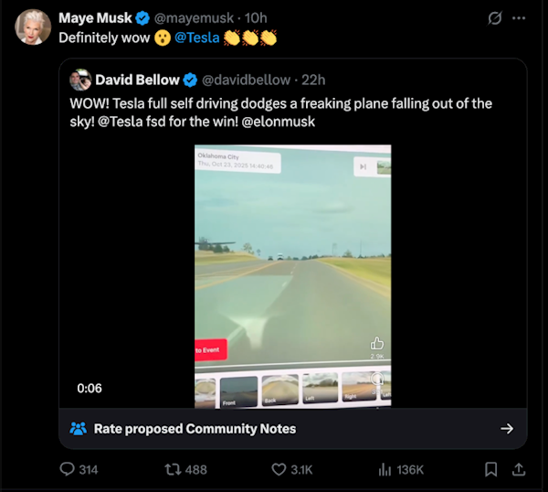 視頻經(jīng)特斯拉粉絲轉(zhuǎn)發(fā)后,被誤貼上“FSD成功規(guī)避墜機(jī)事故”的標(biāo)簽,甚至