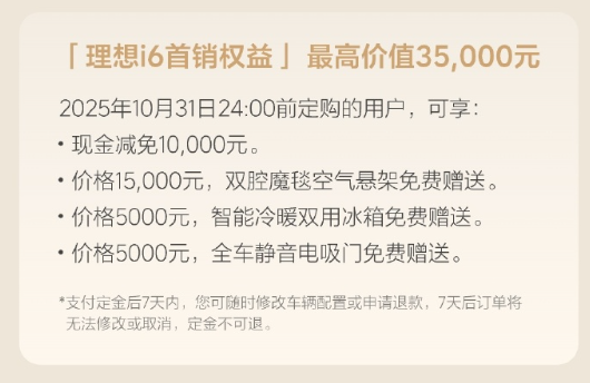 今日,理想汽車公布了理想i6車型11月限時購車權益,活動時間為2025年11月1日至11月30日24:00,總價值達30000元。權益包括現(xiàn)金減免5000元、贈送價值15000元的雙腔魔毯空氣懸架、價值5000元的智能冷暖雙用冰箱以及價值5000元的全車靜音電吸門。與上個月相比,現(xiàn)金減免從10000元調整為5000元,其他權益保持不變。