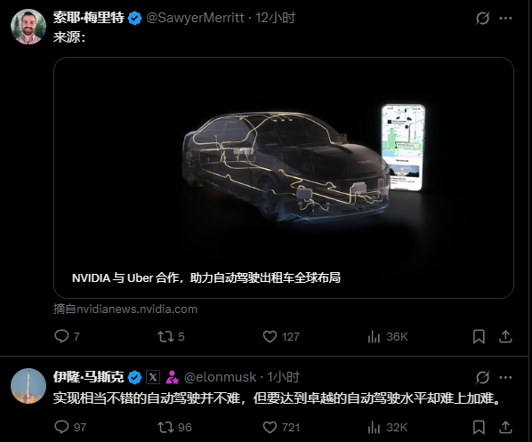 馬斯克回應(yīng)英偉達(dá)與優(yōu)步合作共建全球最大規(guī)模L4自動(dòng)駕駛車(chē)隊(duì)。馬斯克表示,自動(dòng)駕駛達(dá)到“相當(dāng)不錯(cuò)”的水平很容易,但達(dá)到“卓越”的水平卻相當(dāng)困難。