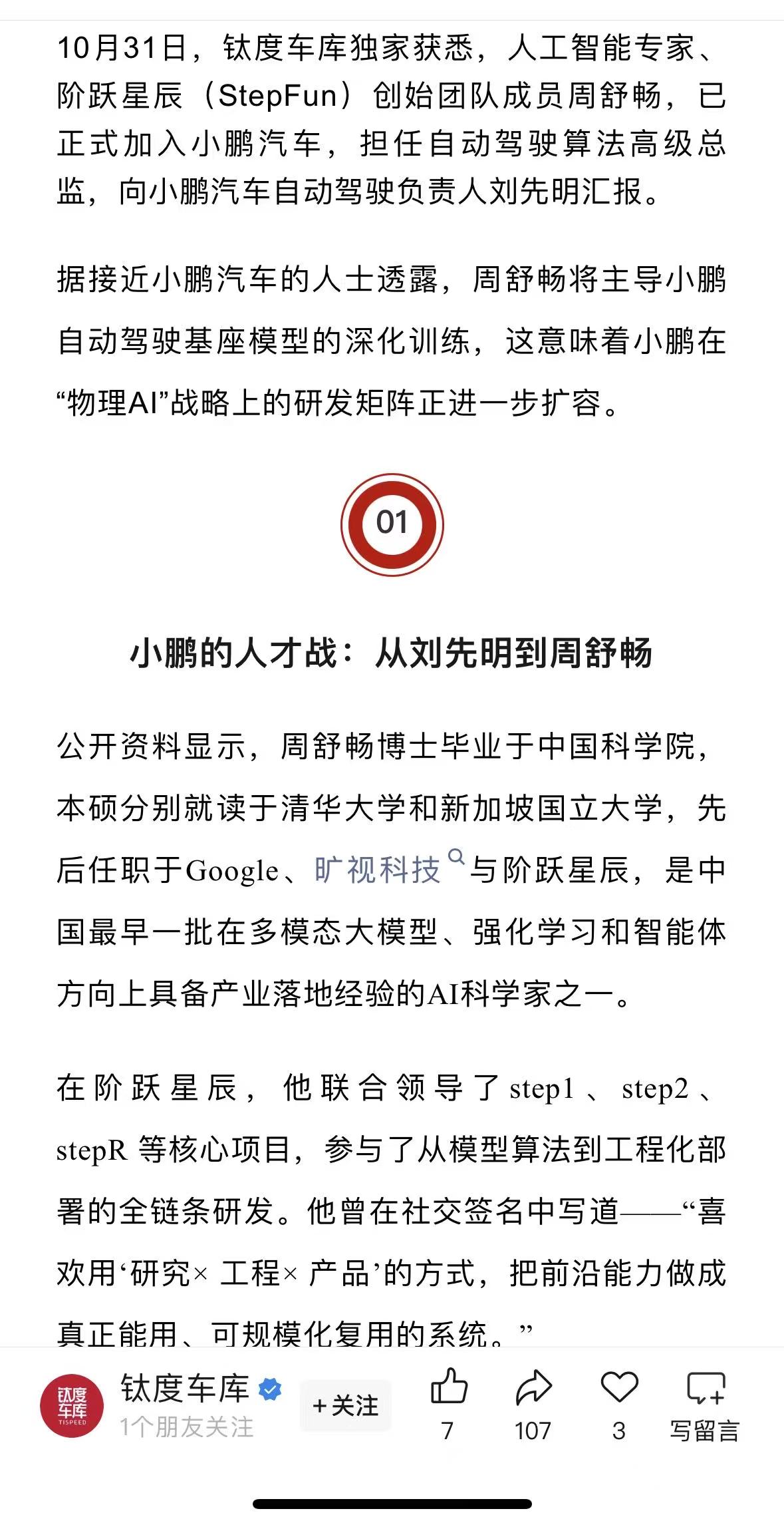 10月31日,鈦度車庫(kù)獨(dú)家消息,人工智能專家周舒暢加入小鵬汽車,擔(dān)任