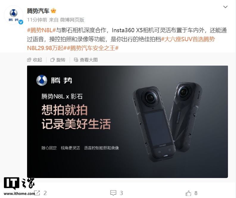 此外,騰勢(shì)N8L還與影石相機(jī)展開(kāi)深度合作,Insta360 X5相機(jī)可以靈活布置于車(chē)內(nèi)外,并通過(guò)語(yǔ)音控制實(shí)現(xiàn)拍照和錄像功能。這一合作進(jìn)一步豐富了騰勢(shì)N8L的智能互聯(lián)功能,提升了用戶(hù)體驗(yàn)。通過(guò)這些合作,騰勢(shì)N8L不僅在智能駕駛和家居控制方面有所突破,也在車(chē)載娛樂(lè)和攝影方面展現(xiàn)了創(chuàng)新能力。
