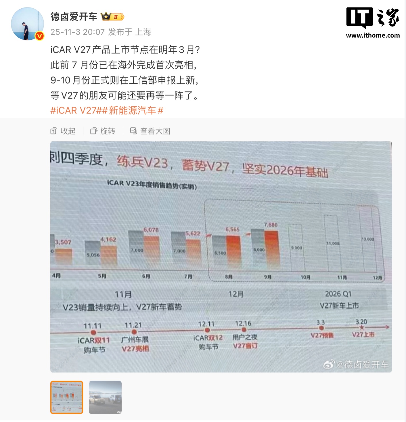 11月3日,奇瑞iCAR品牌宣布,旗下全新中型增程SUV V27將于明年3月3日開啟預(yù)售,并計(jì)劃在同月20日正式上市。V27作為iCAR品牌目前最大的車型,延續(xù)了V23的硬派設(shè)計(jì)風(fēng)格,車身尺寸為4909/1976/1855或1894mm,軸距達(dá)到2910mm,提供兩種不同樣式的“小書包”設(shè)計(jì),預(yù)計(jì)為外掛式備胎或儲(chǔ)物箱。