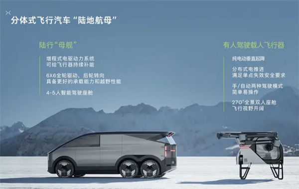 全球首款量產(chǎn)分體式飛行汽車“陸地航母”采用“陸行體+飛行器”分體設(shè)計,陸行體采用三軸六輪設(shè)計,可獨立使用,滿足日常通勤需求。搭載全域800V碳化硅高壓增程平臺,續(xù)航里程超1000公里,同時能在行駛和停車時為飛行器充電,支持5-6次飛行。載人飛行器為電動六旋翼雙涵道構(gòu)型,機身主體結(jié)構(gòu)和槳葉采用碳纖維材料,兼顧高強度和輕量化。飛行器降落后,陸行體通過