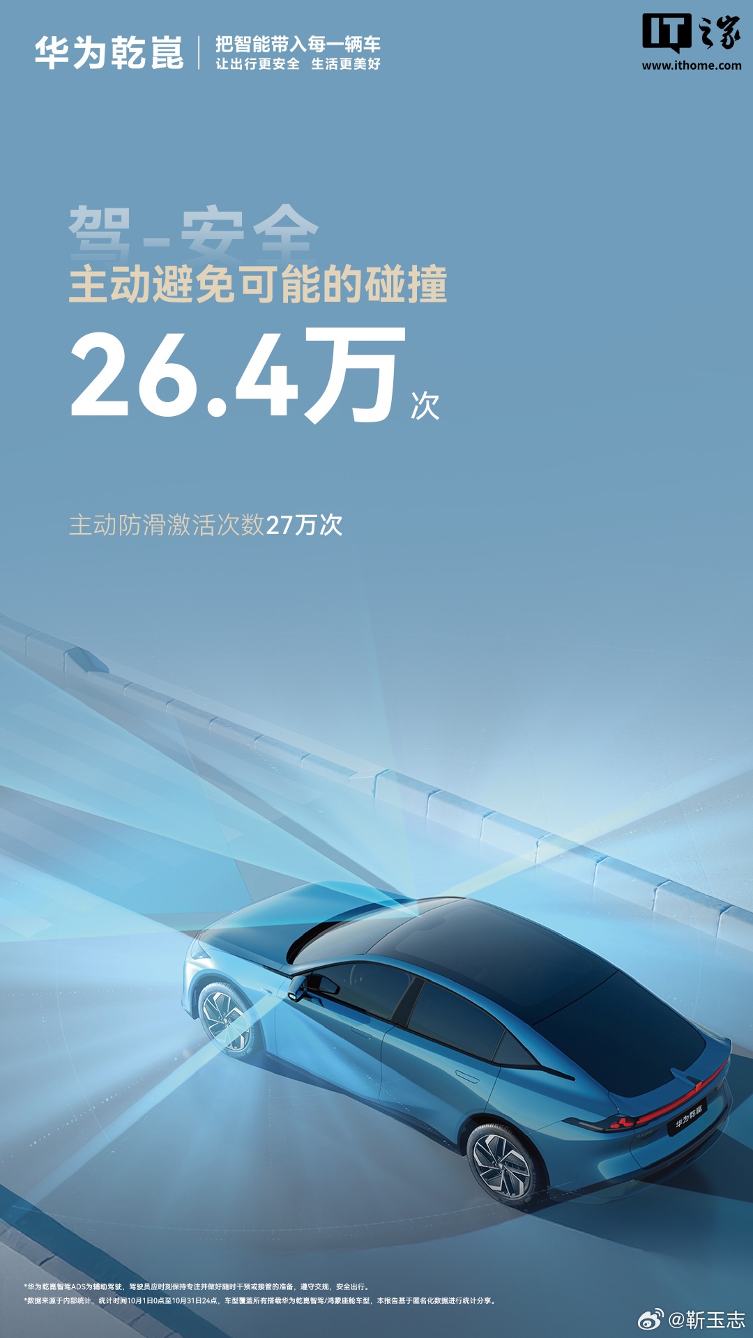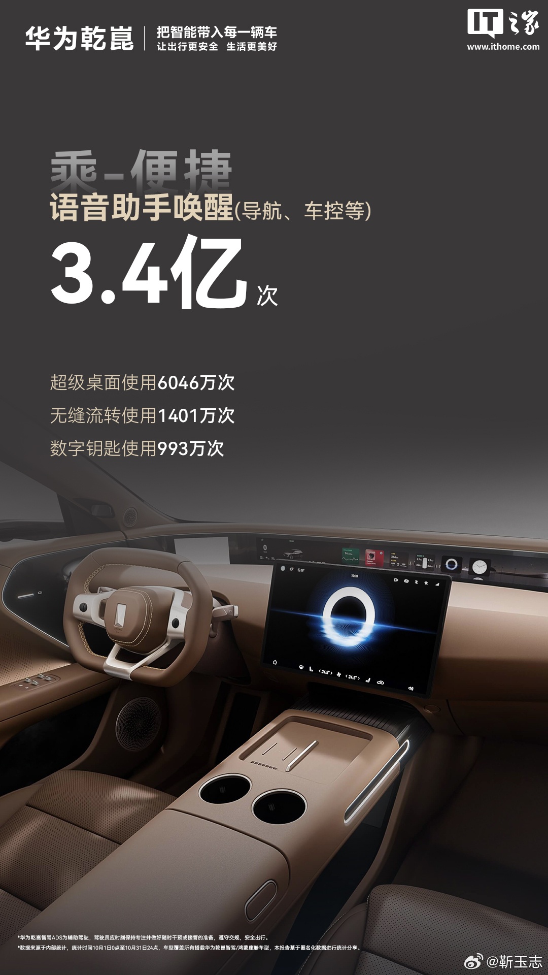 華為智能汽車解決方案BU CEO靳玉志近日分享了華為乾崑用戶的10月出行報告。報告顯示,華為乾崑輔助駕駛里程在10月新增6.81億公里,相當(dāng)于繞赤道1.7萬圈。同時,語音助手被喚醒了3.44億次。此外,華為乾崑輔助駕駛系統(tǒng)在10月主動避免可能的碰撞26.4萬次,分神監(jiān)測提醒1.1億次,泊車輔助使用3657萬次。