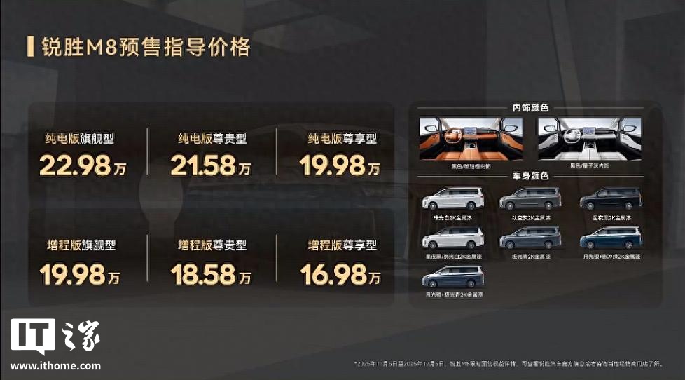 11月5日,北汽制造宣布其中大型MPV銳勝M(fèi)8開啟預(yù)售,預(yù)售價(jià)區(qū)間為16.98萬(wàn)元至22.98萬(wàn)元。銳勝M(fèi)8提供純電和增程兩種動(dòng)力版本,以及7座和9座兩種座椅布局。新車前臉采用大尺寸豎條幅鍍鉻前格柵設(shè)計(jì),車身側(cè)面配備側(cè)滑門和可選裝的電動(dòng)側(cè)滑門,車尾則有貫穿式燈組和隱藏式排氣布局。車內(nèi)配置懸浮式液晶儀表盤和中控屏,以及雙輻式雙拼皮質(zhì)包裹方向盤。