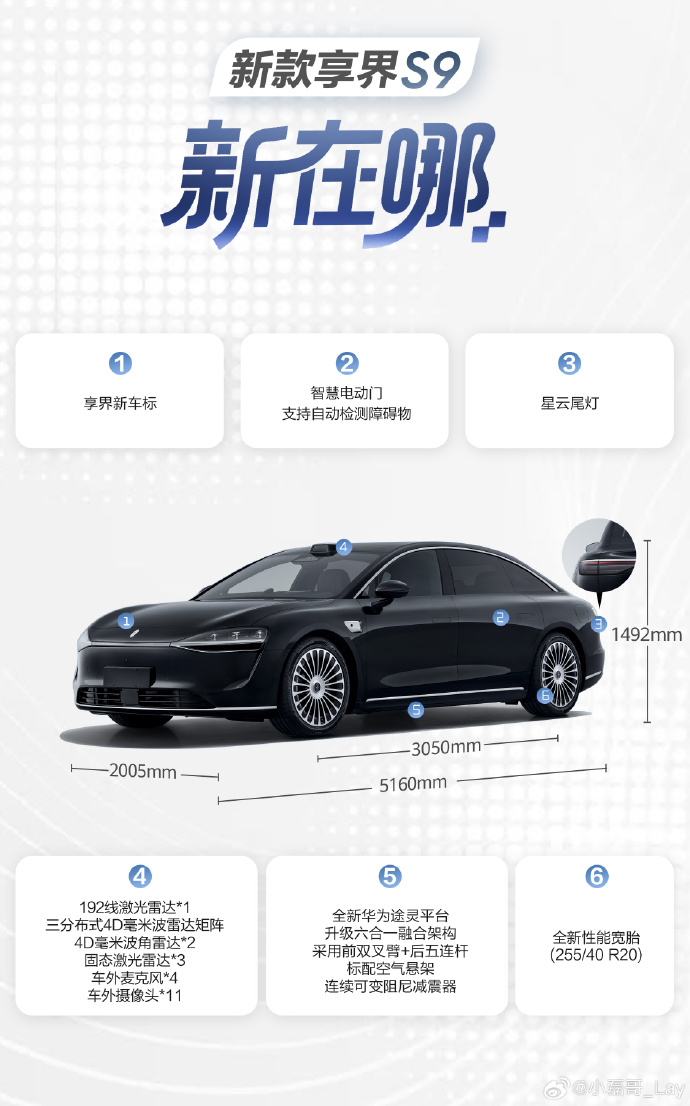 享界S9搭載了HUAWEI ADS 4.0系統(tǒng),支持高速領(lǐng)航輔助和城區(qū)領(lǐng)航輔助功能。新車還配備了全新華為途靈平臺,升級了六合一融合架構(gòu),采用前雙叉臂和后五連桿懸掛系統(tǒng),并標配空氣懸架和連續(xù)可變阻尼減震器。此外,新車還配備了全新性能寬胎(255/40 R20),提升了車輛的操控性能。