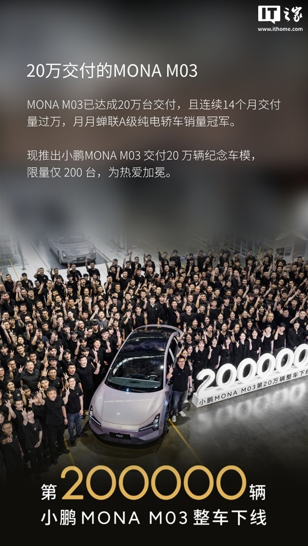 小鵬MONA M03自去年8月上市以來(lái),市場(chǎng)表現(xiàn)突出,僅用14個(gè)月便達(dá)成交付20萬(wàn)臺(tái)的成就,并連續(xù)12個(gè)月交付量破萬(wàn)。上市首月交付量即突破萬(wàn)輛,創(chuàng)下新勢(shì)力純電轎車(chē)首月交付量紀(jì)錄,成為小鵬汽車(chē)的明星產(chǎn)品。