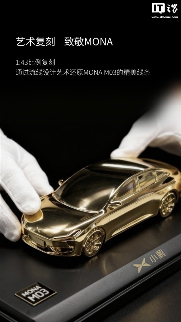 11月11日,小鵬汽車(chē)為慶祝MONA系列交付量突破20萬(wàn)臺(tái),特別推出了1:43比例的復(fù)刻紀(jì)念金車(chē)模。這款限量200臺(tái)的車(chē)模采用24K真金電鍍,售價(jià)為398元,小鵬車(chē)主可使用3980積分抵扣。車(chē)模以MONA M03為原型,鋅合金精密鑄造,搭配24K真金電鍍,展現(xiàn)出高端質(zhì)感。車(chē)模配備鉆石壓紋禮盒,內(nèi)置亞克力防塵罩和胡桃木環(huán)保噴漆底座,尺寸為205×122×100毫米,適合收藏或作為禮品。