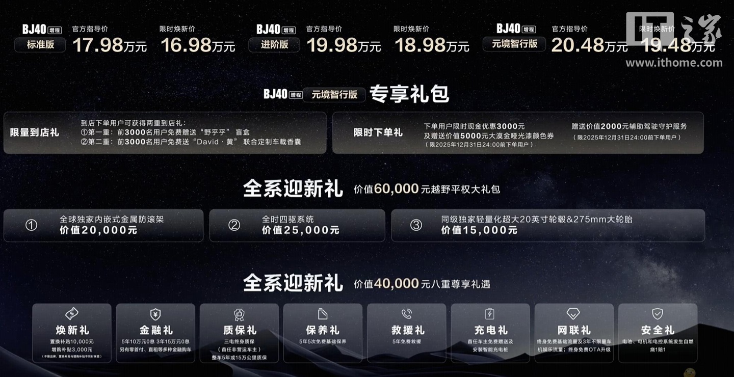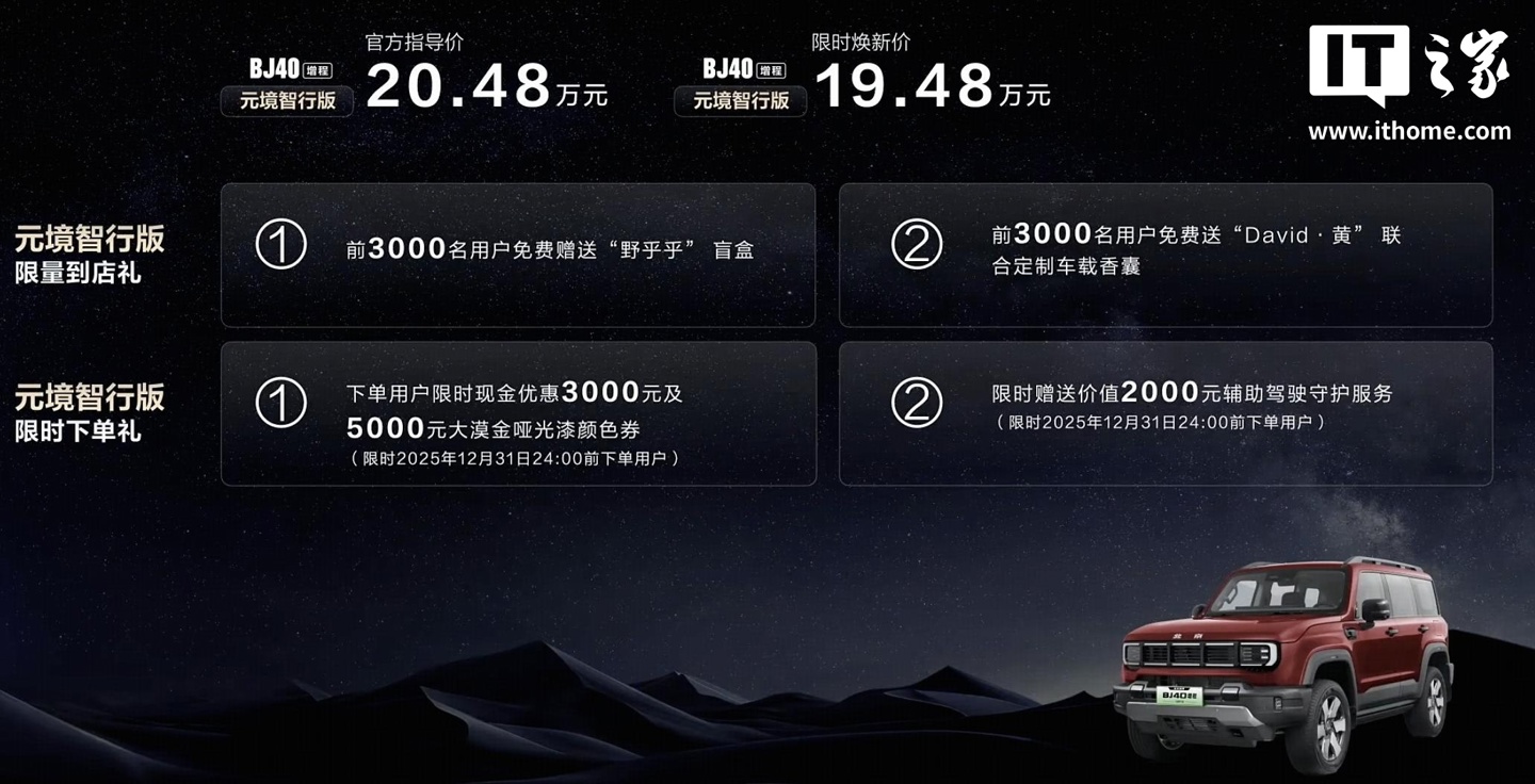 11月13日,北京越野旗下緊湊型SUV BJ40增程元境智行版正式上市,官方指導(dǎo)價20.48萬元,限時煥新價19.48萬元。該車型主要針對輔助駕駛功能進行了升級,自2025年4月下旬至今,BJ40增程版已交付超過30000臺新車,在新能源硬派越野車銷量榜單中表現(xiàn)優(yōu)異。北京越野官方承諾,BJ40增程版提供“燒一賠一”的保障。