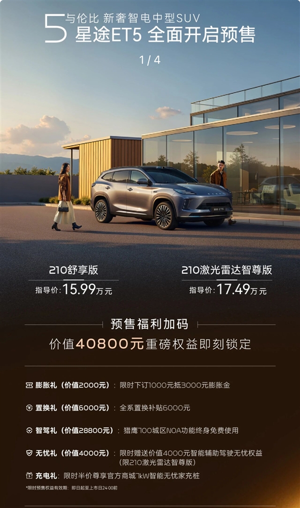 日前,奇瑞旗下高端品牌星途全新中型增程SUV星途ET5正式開啟預售,共推出2款車型,售價分別為15.99萬元和17.49萬元。新車在預售權益上提供了2000元膨脹金、6000元置換