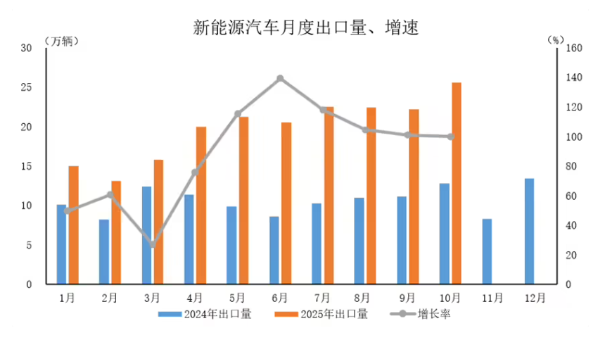 11月17日,中國(guó)汽車工業(yè)協(xié)會(huì)發(fā)布分析報(bào)告,顯示10月份中國(guó)汽車出口量繼續(xù)保持強(qiáng)勁增長(zhǎng)。10月汽車出口量達(dá)到66.6萬(wàn)輛,環(huán)比增長(zhǎng)2.1%,同比增長(zhǎng)22.9%。其中,乘用車出口57.1萬(wàn)輛,環(huán)比增長(zhǎng)2.1%,同比增長(zhǎng)22.8%;商用車出口9.4萬(wàn)輛,環(huán)比增長(zhǎng)1.8%,同比增長(zhǎng)23.5%。新能源汽車出口表現(xiàn)尤為突出,10月出口量為25.6萬(wàn)輛,環(huán)比增長(zhǎng)15.4%,同比增長(zhǎng)99.9%。