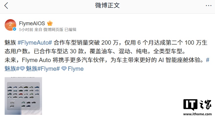 今日,魅族FlymeAuto官方宣布,其合作車型銷量已突破200萬大關(guān)。FlymeAuto的合作車型數(shù)量達(dá)到30款,覆蓋了燃油車、