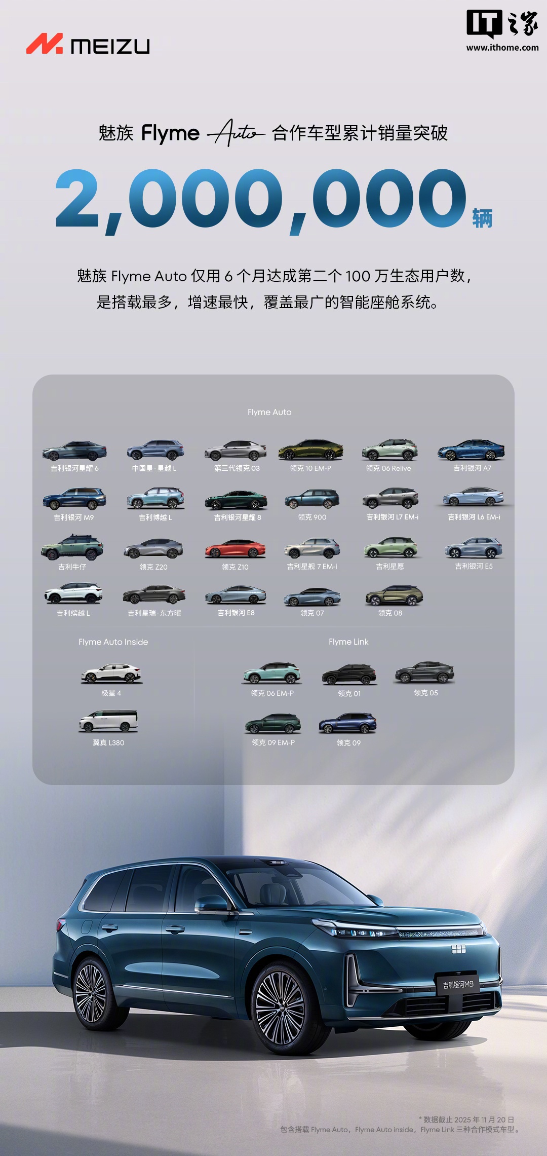 混合動(dòng)力車和純電動(dòng)車等多種車型。魅族官方指出,F(xiàn)lymeAuto在短短6個(gè)月內(nèi)實(shí)現(xiàn)了第二個(gè)100萬生態(tài)用戶數(shù)的增長(zhǎng),成為搭載最多、增速最快、覆蓋最廣的智能座艙系統(tǒng)。10月份,F(xiàn)lymeAuto合作車型單月銷量超過19.5萬輛,同比增長(zhǎng)200%,并且連續(xù)多月單月新增突破10萬。