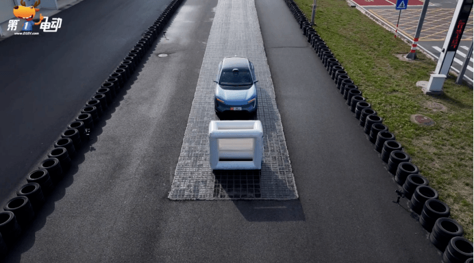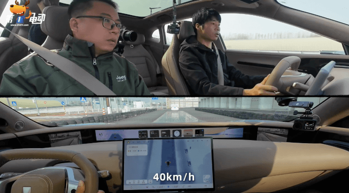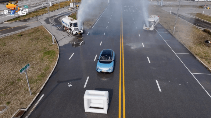 鏡面路本身摩擦系數(shù)極低,遠(yuǎn)超普通雨天路面。為挑戰(zhàn)極限,我們通過(guò)灑水進(jìn)一步提升濕滑程度,并在路面末端放置靜止故障車(chē)作為障礙物,測(cè)試車(chē)輛分別以30km/h、40km/h車(chē)速通過(guò)(受場(chǎng)地限制,未測(cè)試更高車(chē)速)。